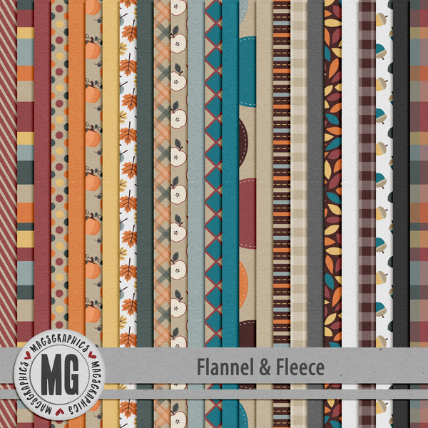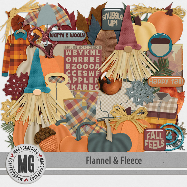 Flannel & Fleece Kit - A chill is in the air, and it's time to pull out your coziest FLANNEL & FLEECE sweatshirts and hoodies. This fun collection has new GNOMIES who are bundled up and ready for autumn. Show off your photos from bonfires, hiking, fall colors, Halloween, and Thanksgiving events. You'll be able to use this collection again and again! This is the MAIN KIT. It includes 25 12"x12" Papers and 55 Elements. All of the following elements are includes: 1 crocheted acorn, 2 pairs of boots, 6 flair, 2 raffia gnomes, 4 gourds, 3 pine greenery, 1 raincoat, 3 journal cards, 1 latte, 6 crocheted leaves, 9 realistic leaves, 5 pumpkins, 3 raffia pieces, 3 rope pieces, 2 flannel shirt elements, 1 stitched star, 1 umbrella. This pack is also sold within the Bundle.