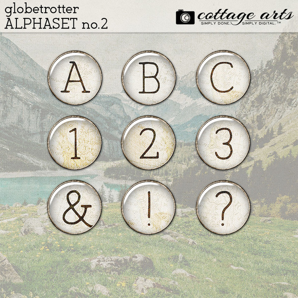 Globetrotter 2 AlphaSet comes with a travel themed flair (glass) upper case alphabet (A-Z, 0-9, &!?), numerals and symbols with on a vintage map background. These are great for travel and everyday layouts! **This kit is included in our Globetrotter Add-on Collection.** Keywords: alphabet, numerals, numbers, grey, gray, round, vintage, artistic. Cottage Arts' Designer: Michelle Shefveland