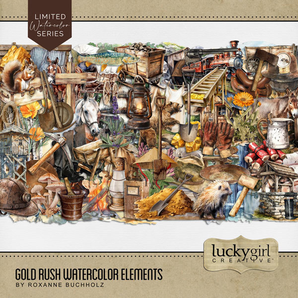 These digital scrapbooking watercolor embellishments, papers, Enhanced Digital Art layered group clusters, and alpha sets are easy to use for western-inspired digital scrapbook pages and outdoor and nature adventures. Use for documenting the California Gold Rush, Alaska and Yukon gold mine adventures, family history, heritage, genealogy, hiking, and camping vacations. The Gold Rush began in 1848 at Sutter's Mill. Immigrants came from around the world causing the rapid growth of settlements and deforestation. The Gold Rush is remembered as a significant event in American frontier history, representing both opportunity and hardship. Embellishments include bear, donkey, burro, fish, horse, porcupine, squirrel, banner, label, bridge, burlap sack, bag, cabin, shack, campfire, cauldron, bonnet, hat, boots, denim blue jeans, Chinese hat, top hat, prospector hat, work gloves, clothesline, wooden cross, dirt, shovel, gold, dynamite, California poppy flowers, lavender, liquorice plant, marigold, mint, witch hazel, flour sack, gold nugget, gun, landscape, forest, trees, pine, stream, river, waterfall, lantern, chest, mortar pestle, milk container, mine cart, mine shaft, mine entrance, helmet, mining pan, mushrooms, pitcher, plank, walkway, rock pile, rope, saddle, chipper ship in San Francisco, railroad tracks, train, railroad, chest, trunk, tent, pick axe, shovel, axe, mallet, Birch trees, trough, covered wagon, water tower, watch tower, barrel, bucket, water pump, wishing well, mill, bench, crate, box, wood logs, cart, wooden fence, sluice, rocker, and more. Bundle includes Burnt Paper Alpha Set, Gold Nugget Alpha Set, Gold Rush Watercolor Papers, Gold Rush Watercolor Clusters, and Gold Rush Watercolor Elements. Designer: Roxanne Buchholz, Lucky Girl Creative