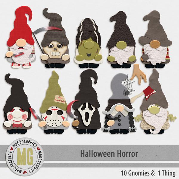 Halloween Horror Enhanced Bundle - Do you like SCARY STORIES? The HALLOWEEN HORROR Series is perfect for all of those spooky movie nights, haunted house tours, and frightening Halloween Costumes! Whether you are being chased by Freddy, Jason, Chucky, or Ghostface, you'll find an assortment of creepy creatures ready to accent your layouts. This is the ENHANCED BUNDLE. It includes TEN 11" Enhanced Photo Clusters, 10 Gnomes, and 1 Thing. Mix & Match these with any of the packs in the Halloween Horror series. Scrap your little monsters as they trick-or-treat along your street!
