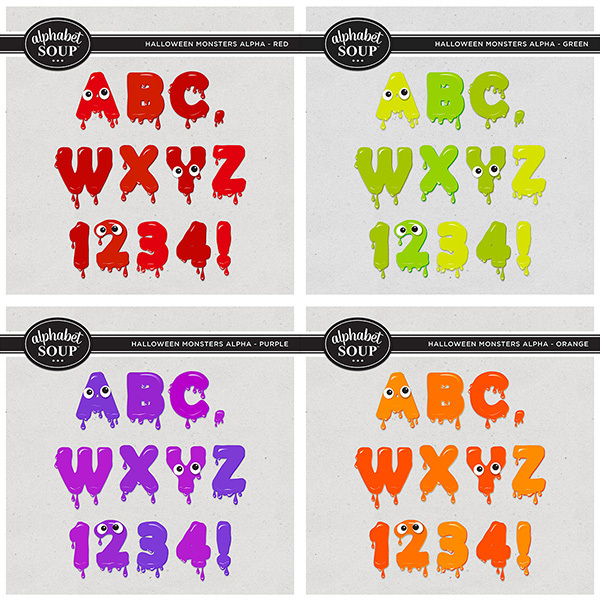 Add the perfect title or word art to your page with alphas by Alphabet Soup. This purchase is for the Halloween Monsters Alpha Bundle. It includes four unique alphas (each with A-Z, 0-9 and limited punctuation).