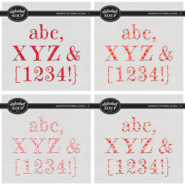 Add the perfect title or word art to your page with alphas by Alphabet Soup. This purchase is for the Hearts Pattern Alpha Bundle. It includes four unique alphas (each with a-z, A-Z, 0-9 and punctuation).