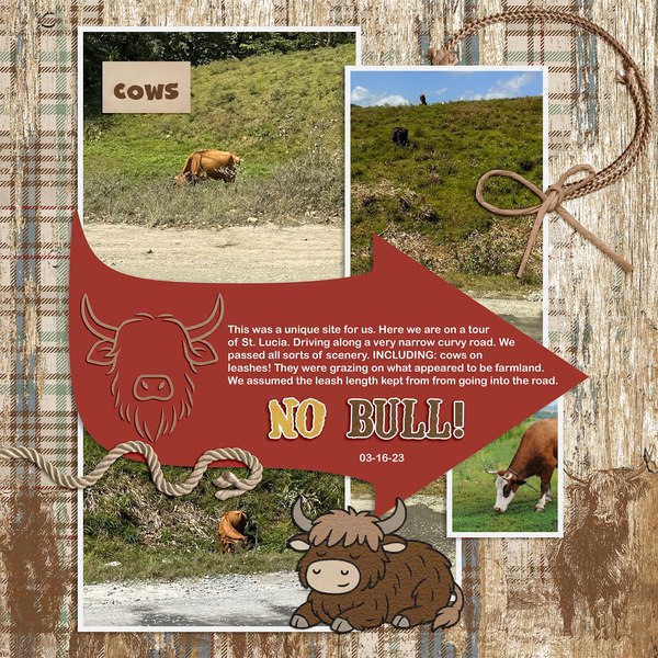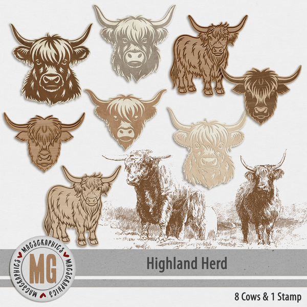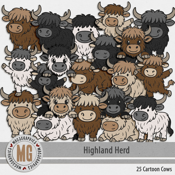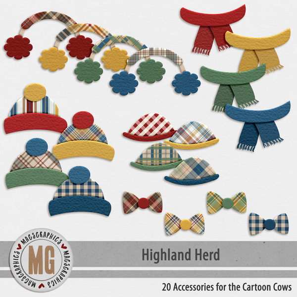 Highland Herd Bundle - Over the rolling hills, the HIGHLAND HERD is grazing! This collection mixes realistic and cartoon elements with beautiful tartan patterns and wood textures. From shaggy-chic cows to dancing hooves and sleepy snouts, every detail is packed with personality. Whether you're capturing cozy countryside memories or adding a touch of MOO-LA-LA to your layouts, these lovable bovines bring warmth and whimsy to every page. This series is UDDERLY irresistible. Let your creativity roam free with the herd! This is the wonderful BUNDLE! It is packed with 189 items: 28 Papers, 82 Elements, 1 Alpha, 8 Stickers, 5 Word Art, and 4 BONUS Enhanced Clusters! The papers include a mixture of solids, tartan plaids, and wood textures. The complete element list includes 20 cartoon cows, 20 cow accessories (4 beanies, 4 bows, 4 earmuffs, 4 hats, 4 scarves), 2 cowbells, 4 cow cutouts, 4 wood cows, 3 flowers, 2 greenery pieces, 2 sets of horns, 1 leather tie, 1 cow face mask, 2 ribbons, 3 ropes, 2 twine pieces, 14 word tags, 8 word art stickers, 5 word art titles, and 4 BONUS Enhanced Clusters. This collection coordinates with the Farmhouse Rustic Series so you can mix & match!