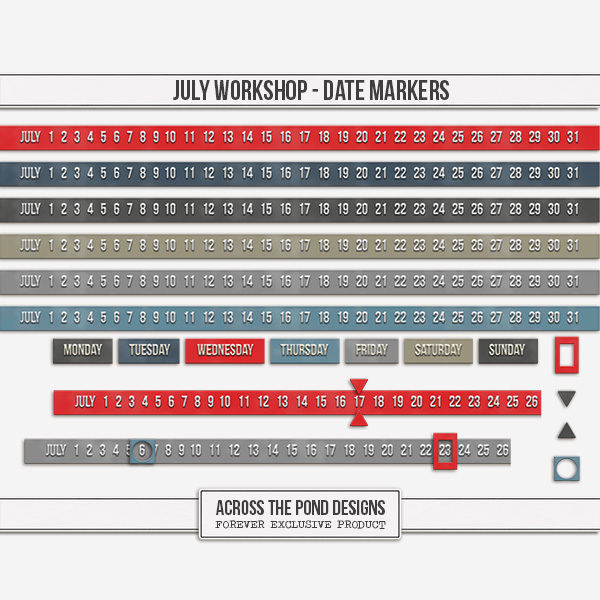 The July Workshop is full of fun patriotic things to scrap with! Filled with red, white, and blue USA elements that celebrate America and the Fourth of July plus firework celebrations, parties, and our military heroes. This purchase is for the July Workshop - Discounted Bundle. It includes the entire July Workshop collection: page kit, month papers, edgers, date markers and templates. Sample pages are created using this collection and thus may show content that is not part of the individual pack.