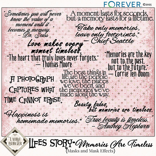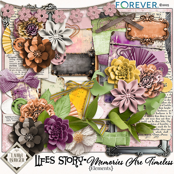 Celebrate the chapters that shaped who you are with Life Story – Memories Are Timeless, a beautifully curated digital scrapbooking collection designed to preserve the stories that matter most. This heartfelt kit blends gentle textures, elegant details, and nostalgic charm to help you document the moments—big and small—that weave together a life well-loved.Keywords: Designs by Laura Burger, Forever digital art, flowers, clip, leaf, frames, dictionary words, ephemera, heart, tag, grunge, tape, doily, ribbon, word art, masks, enhanced art, lavender, green, orange, yellow, pink, brown