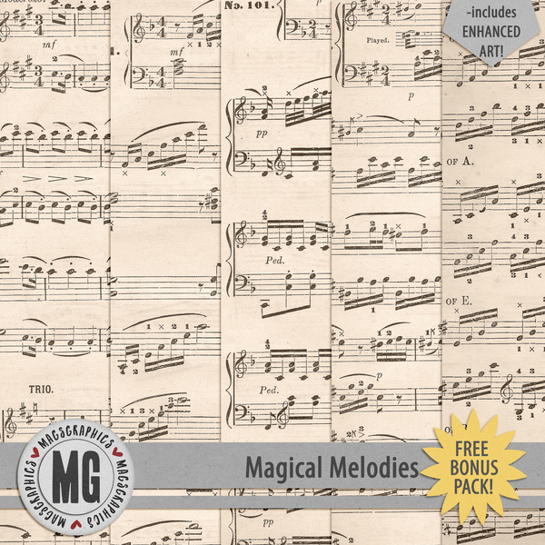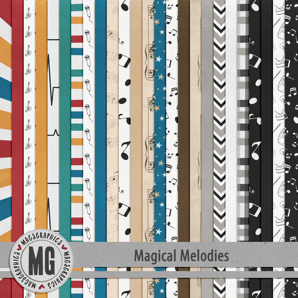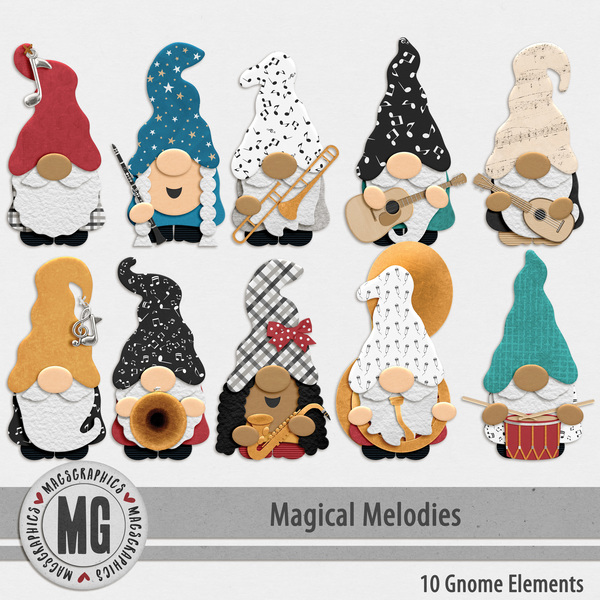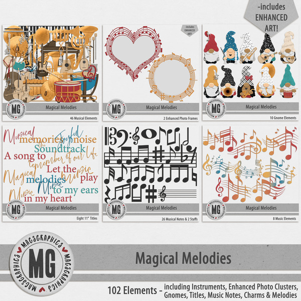 Magical Melodies Bundle - Strike up the band… or orchestra… or recital! The gnomes are taking center stage and can’t wait to play their favorite instruments just for you. The Magical Melodies collection features a huge assortment of papers, instruments, music notes, melodies, and word art to help you create scrapbook layouts that are full of harmony, joy, and heart. Perfect for concerts, recitals, band and orchestra performances, music lessons, and all the musical moments in between! This BUNDLE contains 25 12"x12" Papers, 102 Elements, and 5 BONUS Papers! All of the following elements are included 2 Enhanced Photo Frames, 6 Charms, 10 Gnomes, 38 Instruments-- banjo, string bass, clarinet, cymbals, drums (snare, bass, timpani), drumsticks, flute, French horn, guitars (acoustic & electric), harp, mallets, marimba, mellophone, metronome, oboe, piano & keys, piccolo, recorder, saxophone, sousaphone, trombone, trumpet, tuba, ukulele, violin & music stand, 27 Notes, 2 Staffs, 8 Melodies, and 8 Word Art/Titles. This pack will NOT be un-bundled. The Enhanced Photo Clusters as well as the Masks & Mask Effects are sold separately.
