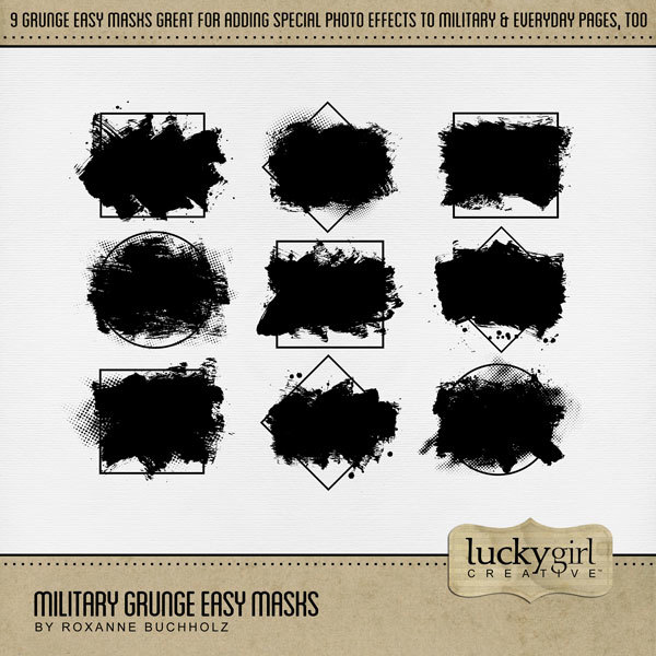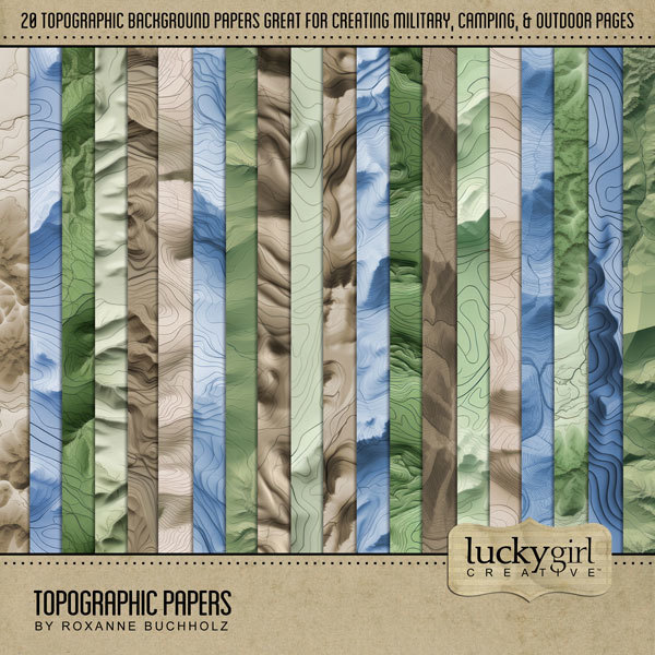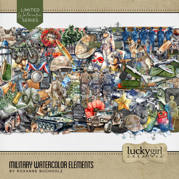 These watercolor embellishments, topographic papers, grunge easy masks, and camo alpha set are packed with action and adventure. Perfect for honoring the Armed Forces, Veteran's Day, Independence Day, 4th of July, and other patriotic and freedom ceremonies. The collection was inspired by all branches of the military including Army, Navy, Air Force, Marines, Coast Guard, and Space Force. Embellishments include aircraft carrier, ship, aircraft, airplane, jet fighter, vintage airplane, dog, German Shepherd, cannon, artillery, barbed wire, barber chair, hair clipper, boot camp, bullet proof vest, cap, hat, hard hat, satellite dish, dog tag, soldier, drone, forget me not flowers, hand gun, gas mask, helicopter, transport vehicle, medal of honor, badge, ribbon, missile launcher, motorcycle, rope course, obstacle course, wall, soldier, poppy, snow globe, radio, rifle, gun, spotting scope, shield, boots, silhouette, toy soldiers, astronaut, space shuttle, submarine, military tank, tent, tires, Humvee, Jeep, truck, cargo truck, coffin, American flag, wreath, walkie talkie, bullet, bomb, grenade, camo, camouflage, and more! This bundle contains Topographic Papers, Military Camo Alpha Set, Military Watercolor Camo Spots, Military Grunge Easy Masks, Military Watercolor Kit, and Military Watercolor Elements. Designer: Roxanne Buchholz, Lucky Girl Creative