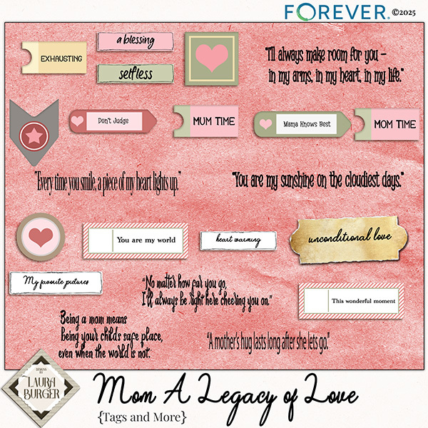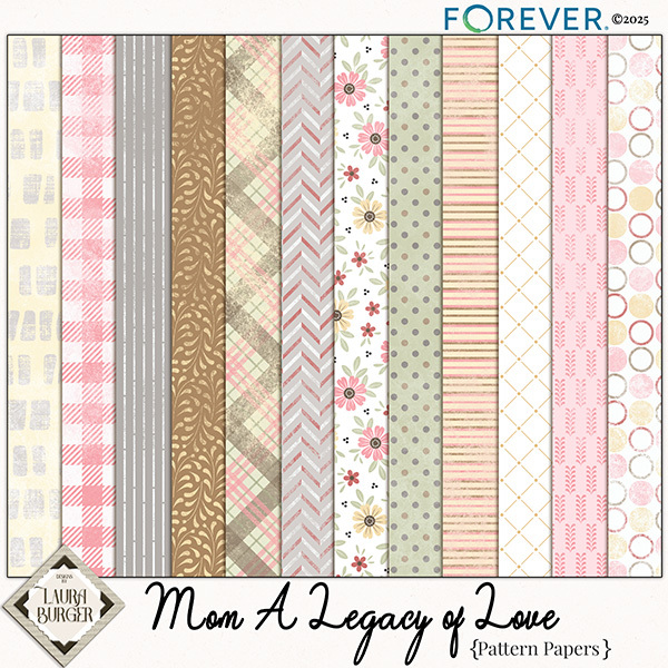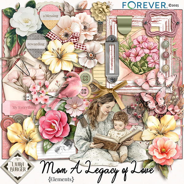 Celebrate the heart of your family with "Mom: A Legacy of Love", a beautifully curated digital scrapbooking collection designed to honor the warmth, wisdom, and enduring strength of mothers. This elegant kit features soft florals, heartfelt word art, soft grunge textures, and timeless embellishments—perfect for preserving cherished memories, writing personal tributes, or creating a family heritage album.Whether crafting a digital keepsake, making a printable card, or designing a photo book, this versatile kit helps you capture the essence of a mother's love through every carefully placed element. Let every page you create with "Mom: A Legacy of Love" be a tribute to the woman who gave you everything.Keywords: Designs by Laura Burger, Laura Burger, textures, tan, brown, off white, yellow, pink, green, red, dark pink, gold, grunge, pattern papers, edgers, birds, clips, brad, butterfly, flower, tags, labels, notebook, stamps, women with child, journal, frames, mask, enhanced art, solid papers, word art, words, bookplate, bouquet, bow, button, doily