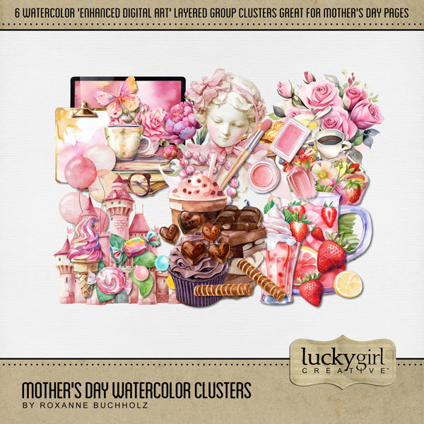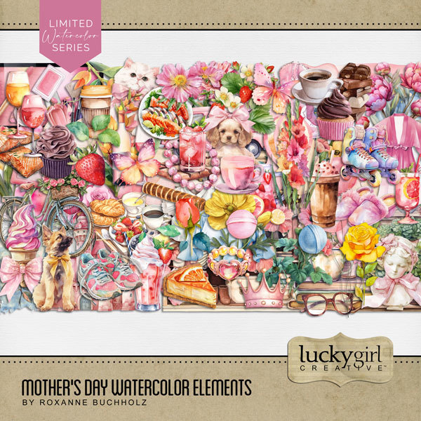 Add a touch of warmth to your summer, spring, Mother's Day, birthday, and girl-themed pages with these beautiful watercolor embellishments, pretty background papers, floral frames, Enhanced Digital Art grouped clusters, and alpha set in tones of pinks and yellows. Embellishments include kitty cat, puppy dog, balloon, bicycle, bike, books, tea cup, flowers, roses, bouquet, wildflowers, breakfast in bed tray, butterfly, VW bug car auto, castle, clipboard, bookcase, blouse, shirt, denim skirt, robe, cowgirl boots, slippers, t-shirt, color splash, tablet, computer screen, makeup, crown, drink, cocktail, coffee, tea, hot cocoa, chocolate, shake, milkshake, strawberry lemonade, wine, floral, orchid, leaf, cheesecake, wafer, cupcake, dumplings, ice cream cone, salmon, sushi, presents, gift, gift box, hot air balloon, jewelry, ring, necklace, pearls, lantern, ribbon, bow, roller skates, sneakers, tennis shoes, spa, bath bomb, statue, and succulents. This bundle includes Pink Lemonade Alpha Set, Mother's Day Watercolor Floral Frames, Mother's Day Watercolor Clusters, Mother's Day Watercolor Elements, and Mother's Day Watercolor Tile Papers. Designer: Roxanne Buchholz, Lucky Girl Creative