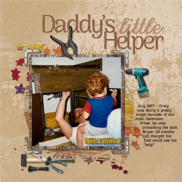 All of us need a handyman once in a while (maybe more than that around here!). The Mr. Fix-It Snapshot Page Kit has a little bit of everything you need to scrap and honor those people in your life who help out with everything that needs fixed, big and small and love home improvement projects! It includes 12 grungy papers, cable ties, chisel, 2 clamps, 4 corners, 4 cardboard words (WORKSHOP, TOOL BELT, WORK BENCH, TOOL BOX), drill, drill bit, earphones, 3 frames, gloves, hammer, 10 pieces of hardware, 2 journal cards, 2 journal spots, utility knife, 5 worded labels (TOOLS, HANDYMAN, HONEY DO, FIX ME!, TOOL GUY) and a blank label, ladder, mallet, 2 nails, paint brush, paint bucket, paint roller, brush, pliers, pry bar, sanding disc, saw, scraper, 2 screws, screwdriver, setsquare, sign, snippers, wrench, duct tape, painters tape, roll of tape, tool belt, 3 trims, string, vice, wire and wood shaving. This page kit is included as part of the Man-Up Collection.