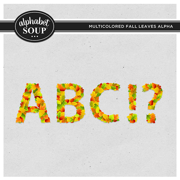 Add the perfect title or word art to your page with alphas by Alphabet Soup. This purchase is for the Multicolored Fall Leaves Alpha. It includes A-Z and very limited punctuation.