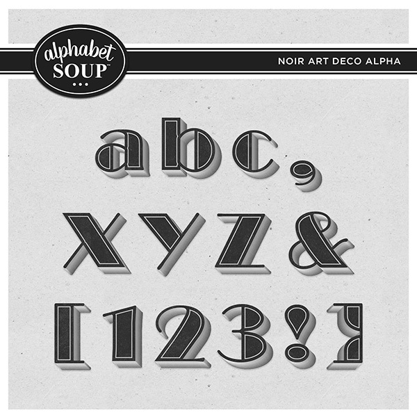 Add the perfect title or word art to your page with alphas by Alphabet Soup. This purchase is for the Noir Art Deco Alpha. It includes a-z, A-Z, 0-9 and punctuation.
