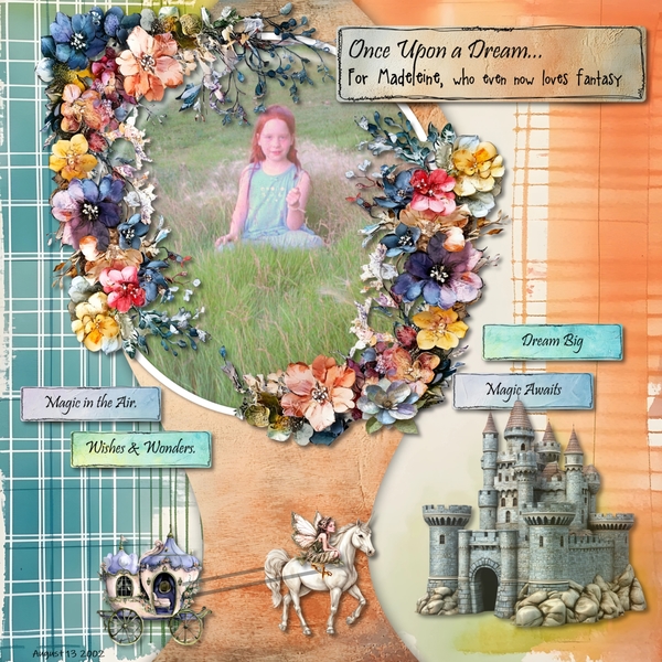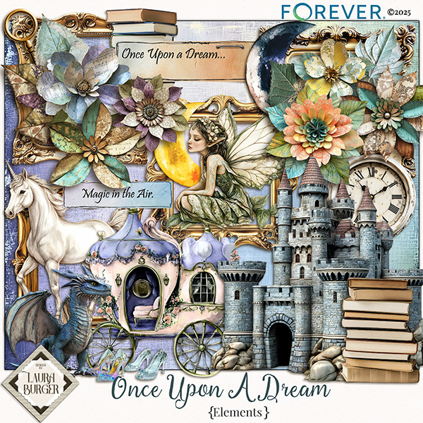 Step into a whimsical world where imagination takes flight and dreams come to life. Once Upon A Dream is a magical digital scrapbooking collection inspired by fairy tales, starry wishes, and soft, enchanted moments. Whether you're preserving childhood memories, romantic stories, or daydreams of wonder, this kit brings a gentle, storytelling charm to your pages.Keywords: Designs by Laura Burger, Laura Burger, magical, dream, dreaming, carriage, labels, chain, unicorn, flowers, books, fairy, clock, dragon, frames, key, leaves, moon, star, overlay, slippers, shoes, staple, stem, tag