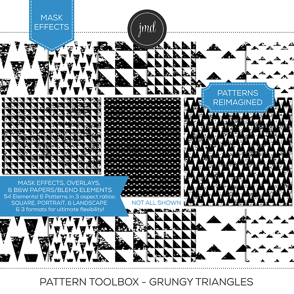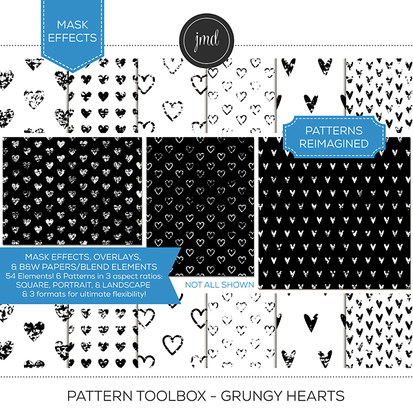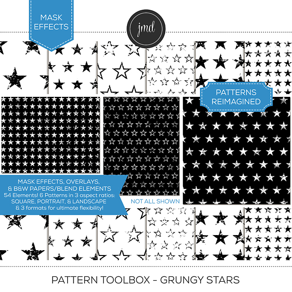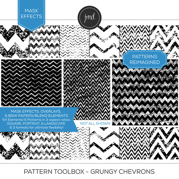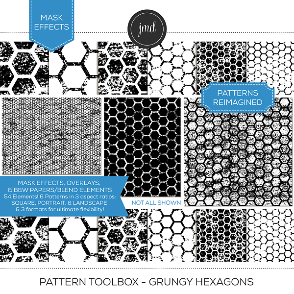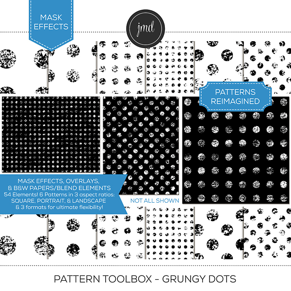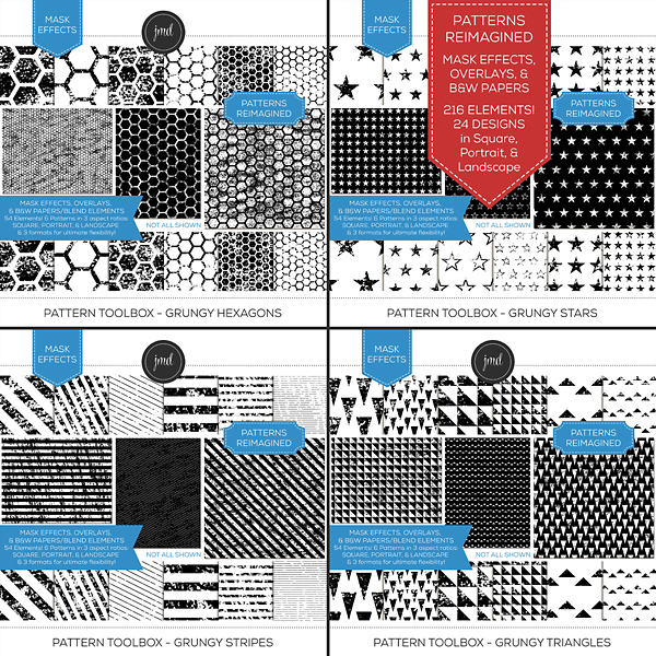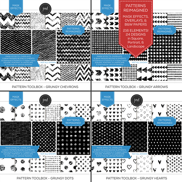 Overlays, Effects, and Black & White Blending Papers! This is much more than your standard overlay bundle. This bundle includes 432 elements! There are 48 unique, grungy pattern designs provided 3 ways and in 3 aspect ratios for ultimate flexibility. Each pattern is provided in the following aspect ratios: (12x12) Square, (8.5x11) Portrait, & (8.5x11) Landscape. Each size comes in 3 formats: Embellishments (standard, transparent overlays), Effects (easy masks), and Black and White Blending Papers. Create customized, beautiful papers with endless possibilities! Kits included in the bundle: Pattern Toolbox – Grungy Bundle 1 and Pattern Toolbox - Grungy Bundle. Please be aware that these patterns were included as 12x12 overlays ONLY in the Grungy Pattern Overlay Bundles 1 & 2 kits previously sold.