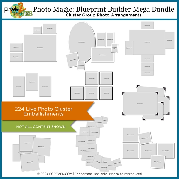 The perfect starter pack of a wide variety of photo arrangements which will allow you to create pages quickly and easily. This Mega Bundle includes grouped photo arrangements as embellishments from the following Blueprint Builder Kits: Art Deco, Bless Our Nest, Cookbook, Desert Dreams, Enchanted Forest, Flight, Hollywood, Honeybee, Message In A Bottle, Mountain Top, Out of This World, Photography, Picnic, Pumpkins & Vines, Serenity, Storyteller, Succulent Garden, Summer Fair, Time to Travel, To the Moon Space, To The Moon, Tranquility, Wings and Petals, and Winter Wonderland