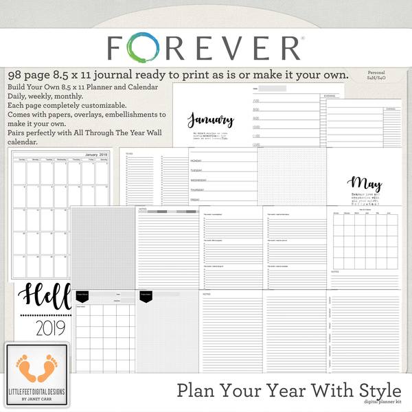 Designing your 2019 calendar has never been easier or more gorgeous! Comes with 98 pages 8.5 x 11 journal-ready to print as is or make it your own. Build your own planner and calendar daily, weekly, monthly... each page completely customizable. Comes with papers, overlays and embellishments to make it your own. Pairs perfectly with All Through The Year Wall Calendar.