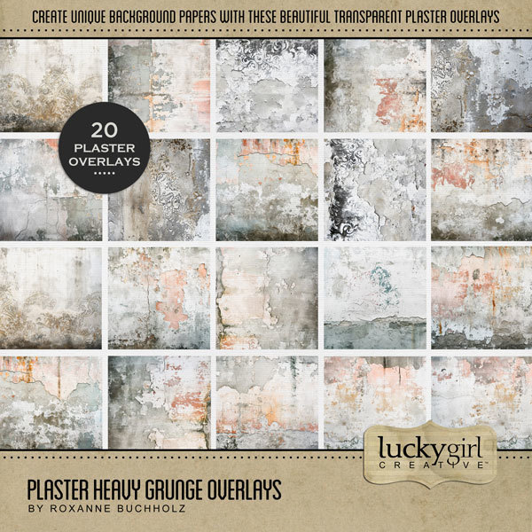 Add beautiful transparent heavy grunge plaster overlays and textured papers to all your digital scrapbooking pages! Try layering over different colored digital papers to create a one-of-a-kind look! Great for travel, historic sites, vacations, family history, heritage, genealogy, and more! This kit includes the Plaster Heavy Grunge Papers and the Plaster Heavy Grunge Overlays. Designer: Roxanne Buchholz, Lucky Girl Creative
