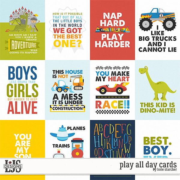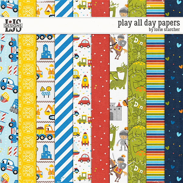 Play All Day by LJS Designs is a digital scrapbooking kit for little boys and their toys. Now that I am a grandma, my best days are spent playing with my grandson, discovering his new interests and watching him grow as he learns by playing. I may have created this kit with Wren in mind, but it also perfect to scrap play time with your little guy, scrap about his favorite toys or scrap his every day moments as he too grows through playing. Buy the Bundle and get the kit and the extra packs for a special price.