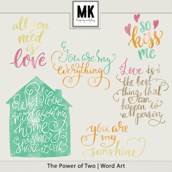 Love is in the air! The Power of Two is created with some unique color combinations that are bright, fun and perfect for celebrating togetherness! This purchase is for the Power of Two Word Art. It includes 8 pieces.