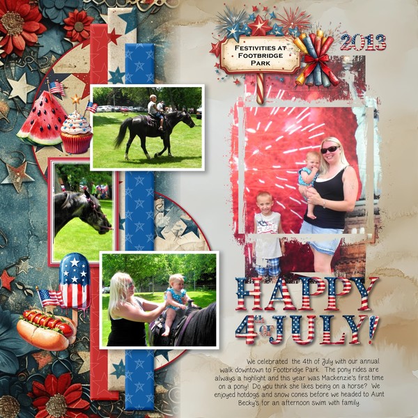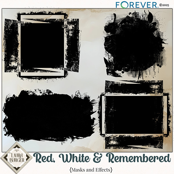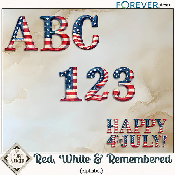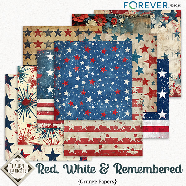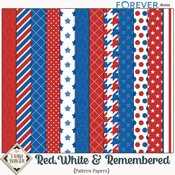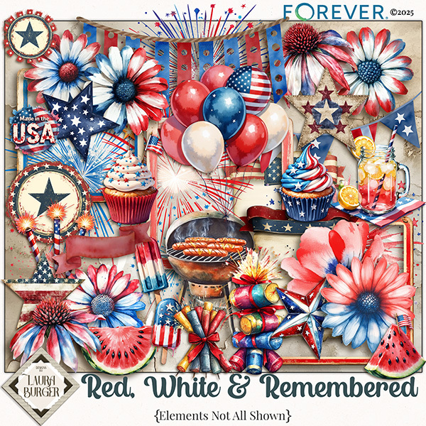 Red, White & Remembered is a heartfelt digital scrapbooking kit that celebrates patriotism, cherished memories, and timeless American spirit. Perfect for documenting Independence Day festivities, military tributes, family barbecues, and summer celebrations, this collection is a tribute to those moments that deserve to be remembered. This kit features a vibrant palette of classic red, crisp white, and deep navy, paired with vintage textures. You'll find a rich array of elements including stars and stripes, fireworks, bunting, florals, journaling cards, and an alphabet that honors both country and community. Whether you're preserving the joy of a 4th of July parade, honoring a loved one's service, or simply capturing backyard memories, Red, White & Remembered provides the perfect blend of nostalgia and celebration. Keywords: Designs by Laura Burger, bunting, red, white, blue, fireworks, flowers, watermelon, bbq, texture, backyard, family memories, 4th of July, corn on cob, cupcake, ice drinks, stars, popsicle, frames food, hamburger, banner, journaling card, hot dog, patriotic, patriotism, American spirit, summer, backyard memories, family times, alphabets, numbers, border papers, masks, mask effects, patterns, solid papers, grunge