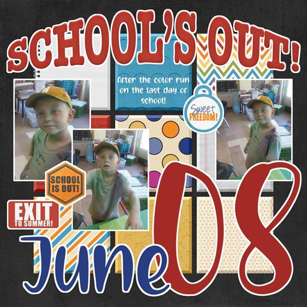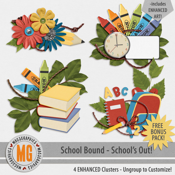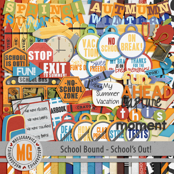 School Bound School's Out Bundle- School is OUT for the summer (or winter break, fall break, or spring break), and you've got a lot of photos to scrap! By the end of the year, the crayons are broken, the papers are wrinkled, and the pencils are ground down to stubs. Use this SCHOOL'S OUT collection to showcase those end-of-the-year pictures. Mix and match with any of the School Bound series for endless possibilities! Save $$, and get the entire SCHOOL'S OUT Collection with this BUNDLE! This Bundle contains 24 12"x12" papers & 188 elements (8 ENHANCED). All of the following elements are included: 1 chewed apple, 1 arrow, 1 backpack, 4 seasonal banners, 6 books, 1 bow, 1 button, 3 callouts, 1 charm, 2 paperclips, 1 clock, 12 broken crayon pieces, 6 new crayons, 6 stubby crayons, 2 journal cards, 4 label tabs, 2 pencils, 2 broken pencil pieces, 1 pin, 1 rainbow, 1 school bus, 4 signs, 1 notebook, 1 sun, 12 tags, 2 word art, 1 yearbook, 4 ENHANCED border/trims, and 4 BONUS ENHANCED clusters.