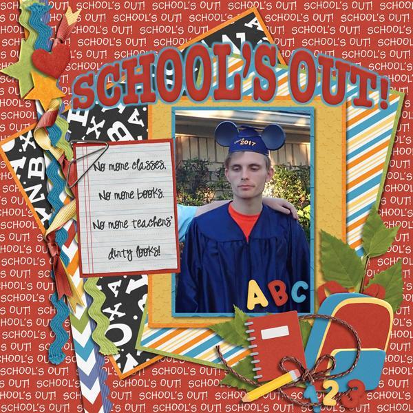 School Bound School's Out Kit - School is OUT for the summer (or winter break, fall break, or spring break), and you've got a lot of photos to scrap! By the end of the year, the crayons are broken, the papers are wrinkled, and the pencils are ground down to stubs. Use this SCHOOL'S OUT collection to showcase those end-of-the-year pictures. Mix and match with any of the School Bound series for endless possibilities! This is the MAIN KIT, and it contains over 100 items - 24 12"x12" papers and 80 elements! The complete element list includes 1 chewed apple, 1 arrow, 1 backpack, 4 seasonal banners, 6 books, 1 bow, 1 button, 3 callouts, 1 charm, 2 paperclips, 1 clock, 12 broken crayon pieces, 6 new crayons, 6 stubby crayons, 2 journal cards, 4 label tabs, 2 pencils, 2 broken pencil pieces, 1 pin, 1 rainbow, 1 school bus, 4 signs, 1 notebook, 1 sun, 12 tags, 2 word art, 1 yearbook. This pack is also included in the School's Out Bundle.