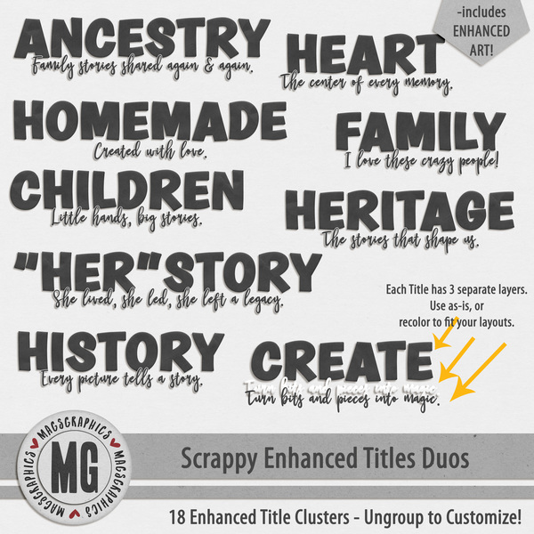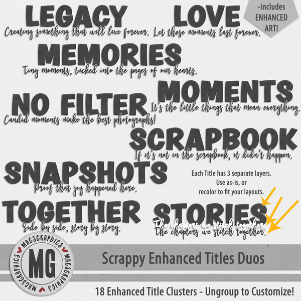 Scrappy Enhanced Title Duos - Looking for the perfect finishing touch for your pages? Scrappy Enhanced Title Duos make your layouts shine with layered dimension and endless flexibility. Each title comes in three customizable parts—a bold keyword, a flowing script subtitle, and a crisp white outline. Use them straight from the Embellishments Panel or ungroup to make them your own: - Recolor with hues, washes, or patterned papers - Move or resize the script for the perfect fit - Mix & match subtitles across different keywordsWith so many creative possibilities, these titles pair beautifully with any kit—especially Cropping With My Gnomies, Shutterbug, or Memory Keeper series. You'll find a VIDEO on how to use my Enhanced Title Duos here: https://l.forever.com/cgVeGgfk.