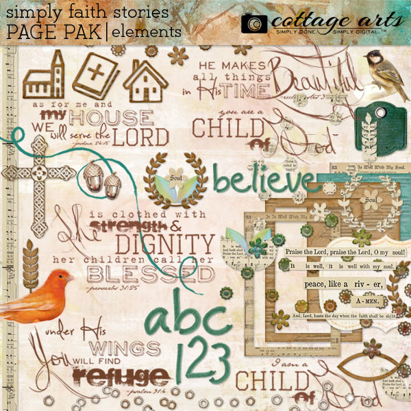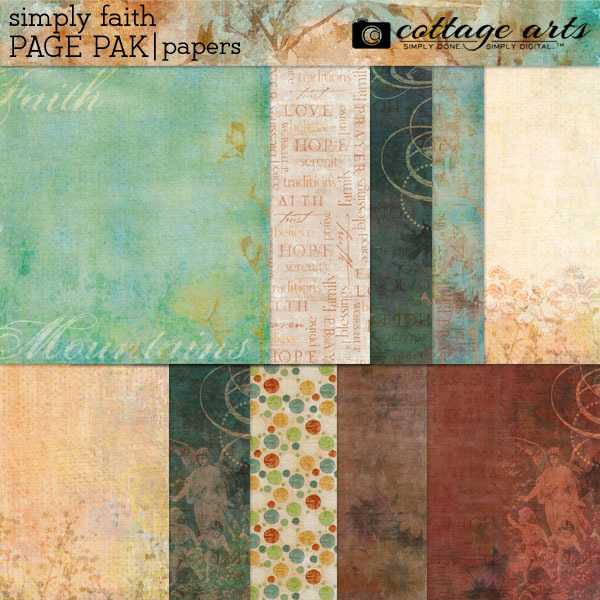 Tell your faith story with Cottage Arts' beautiful Simply Faith Collection (Regular Retail: $34.96)! This large bundle includes Simply Faith Papers and Elements, Cluster Group Frames, Simply Faith 9 Scrap.Words, Simply Faith Stories Papers and Elements, including a hand-drawn AlphaSet! Rich details, beautiful collage, Christian inspired word art and elements make this a one-of-a-kind kit perfect for you to record your journey of faith, mission trips, volunteer activities, children's religious events, and personal journals. Simply Faith Page Pak includes 10-12x12 artistic faith-inspired papers...and a large assortment of creative embellishments (see below). Plus...BONUS 2-12x12 Edge shapes. Simply Faith Stories Page Pak includes 10-12x12 gorgeous hand painted papers, Christian inspired word art, elements, and a coordinating hand-drawn AlphaSet. Simply Faith 9 Scrap.Words comes with 5 Christian inspired word art quotes, 6-9 inches wide at 300 dpi, plus 5 overlay accents (hearts, treble clef, waves, sun flare, and footprints). Word art quotes in 2 styles: brown and color. You can fill quotes and accents with color or paper of choice, if desired, or change color! Perfect for greeting cards! Scrap.Frames 17 comes with 18 different frames/frame clusters (3 of them are used in our Scrap.Templates 26 set), each on a transparent background for you to drag onto any paper for a quick and beautiful page. Includes a square and rectangular single frame with and without lifted drop shadows, plus 16 frame clusters for 2, 3, 4, 6, and 9 photos (with fasteners, paint splotches, butterflies). Keywords: easter, ornate, traditional, blue, brown, green, pink, every day, everyday, faith, religion, Christian, family, inspiration, sympathy, get well, pastel. Cottage Arts’ Designer: Michelle Shefveland