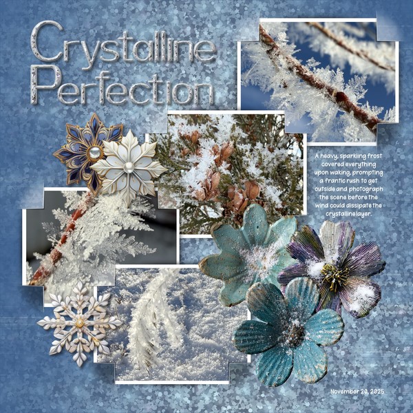 Snow Flowers features 30 snow-flecked blooms with a beautifully frosty finish. These delicate winter florals are perfect for embellishing your cold-weather scrapbook pages and ideal for clustering with snowflakes and other seasonal elements. Add a soft, icy touch to any winter layout with these charming, textured blooms.