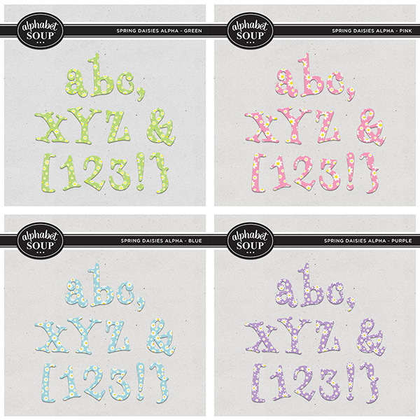 Add the perfect title or word art to your page with alphas by Alphabet Soup. This purchase is for the Spring Daisies Alpha Bundle. It includes four unique alphas (each with a-z, A-Z, 0-9 and punctuation).