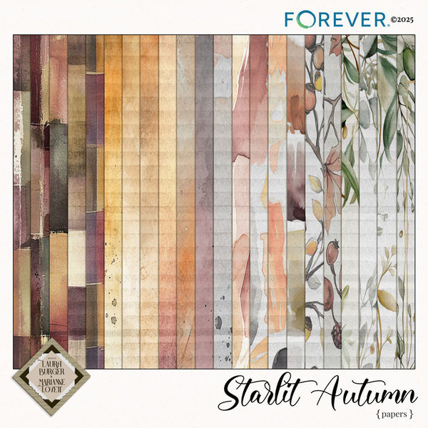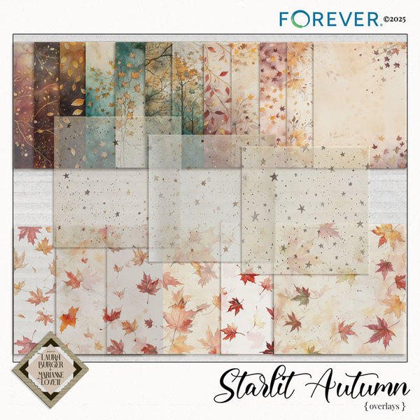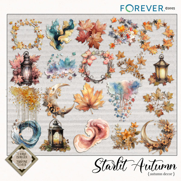 The Starlit Autumn Mini Bundle captures the magic of crisp fall evenings and golden sunsets with a painterly, elegant touch. This collection blends rustic autumn textures with whimsical star-kissed overlays, watercolor leaves, and glowing lanterns to create layoutsthat feel both cozy and enchanting. With richly layered papers, dreamy overlays, and autumn decor elements, this bundle is perfect for preserving seasonal memories, from harvest gatherings to quiet walks under starry skies.Keywords:Starlit Autumn, autumn scrap kit, fall digital scrapbook, watercolor autumn leaves, lantern, moon, stars, overlays, starry night textures, fall wreaths, cozy autumn bundle, rustic watercolor papers, golden fall kit, dreamy autumn overlays, harvest scrapbook, seasonal memory kit, autumn digital art, whimsical fall decor, fall scrapbook mini bundle, Designs by Laura Burger, Marianne Lovett.