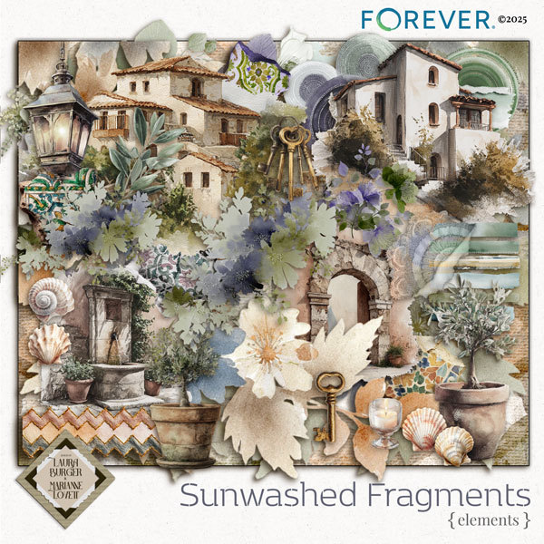 The Sunwashed Fragments Bundle is a warm and timeless digital scrapbooking collection inspired by Mediterranean charm and rustic elegance. Featuring sun-drenched villas, aged stonework, seashells, terracotta pots, vintage keys, lush greenery, and painterly florals,this kit captures the beauty of moments that feel both nostalgic and alive. With washed textures, delicate polka dot papers, and soft masks, the bundle blends earthy tones with subtle touches of color—perfect for preserving everyday stories, vacation memories, orartistic layouts filled with fragments of life.Keywords: Sunwashed Fragments Bundle, Designs by Laura Burger, Marianne Lovett,digital scrapbooking kit, Forever digital art, Forever, Mediterranean scrap kit, rustic villa elements, vintage keys, seashell accents, terracotta pots, olive trees, mosaic tiles, painterly florals, delicate foliage, washed textured papers, polka dot papers, grunge overlays, artistic masks, rustic stone arches, lantern embellishments, timeless memories, vacation scrapbook kit, garden inspired scrap kit, cozy rustic style, Mediterranean charm, botanical accents, textured layers, nostalgic layouts, everyday stories, butterflies, vines, lace