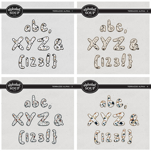 Add the perfect title or word art to your page with alphas by Alphabet Soup. This purchase is for the Terrazzo Alpha Bundle. It includes four unique alphas (each with a-z, A-Z, 0-9 and punctuation).