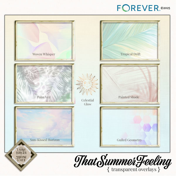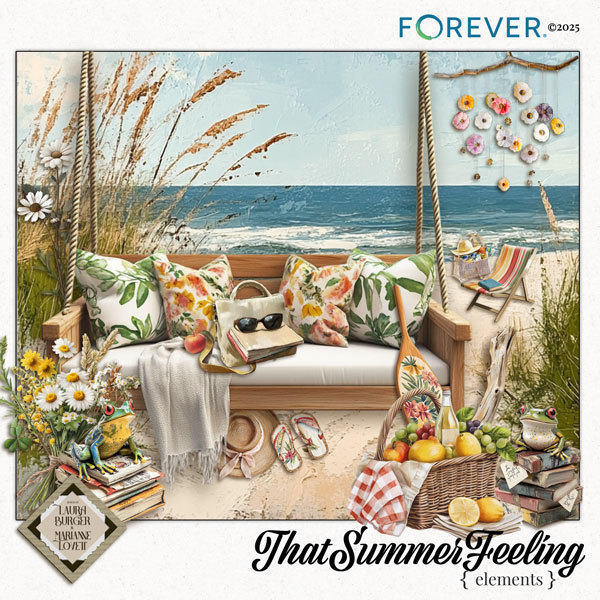 That Summer Feeling is a vibrant digital scrapbooking bundle that captures the carefree charm and golden nostalgia of summer. With painterly beachside elements, vacation ephemera, coastal décor, pastel woodgrain papers, Polaroid-style frames, and sun-washed florals, thiskit is perfect for documenting seaside adventures, warm-weather memories, and relaxed moments in the sun. This collection blends whimsy, vintage flair, and modern texture for an unforgettable creative experience.Keywords: Designs by Laura Burger, digital scrapbooking, beach kit, summer bundle, coastal scrapbook, seaside elements, vacation memories, summer porch, pastel woodgrain papers, Polaroid frames, florals, sand and sea, soft overlays, painterly textures, retro summer, hammock, sunglasses, flip flops, lemonade, seashells, ocean view, Forever digital art, photo masks, whimsical accents, tropical details, bouquet, bracelet, chair, dress, hat, plates, porch, sneakers, strawberries, tag, watermelon, apricot, chimes, daisy, frog, paddle, picnic basket, swing, log
