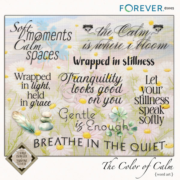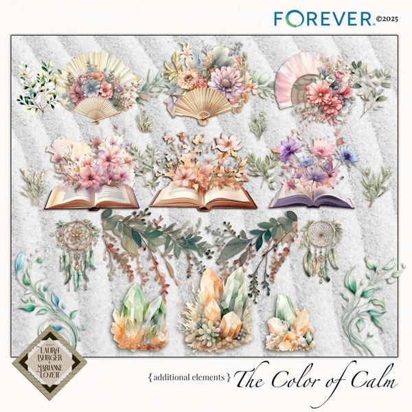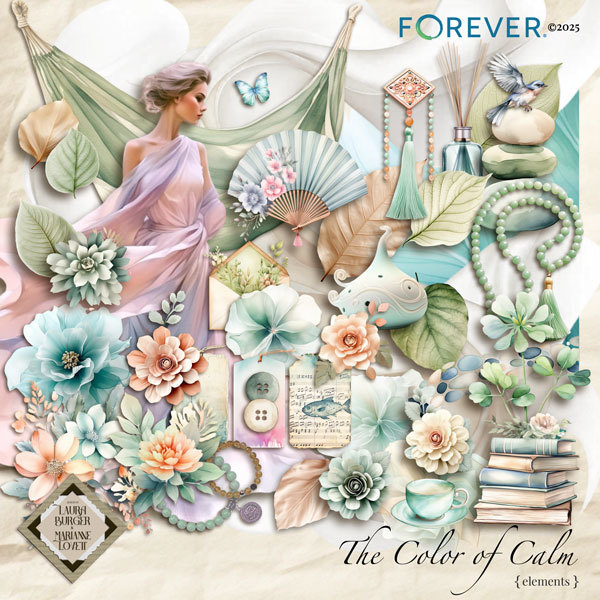 The Color of Calm is a serene digital scrapbooking bundle designed to bring a sense of peace and grace to your creative storytelling. This elegant collection features soft painterly florals, soothing botanicals, tranquil lifestyle accents, and poetic word art, all in acalming palette of soft greens, gentle blues, sandy neutrals, and muted pastels. With flowing fabric textures, delicate fans, books, crystals, and wellness-inspired elements like tea, essential oils, and beads, each piece invites quiet reflection and mindful memory keeping. Use this kit to create layouts that feel like a deep exhale- graceful, grounding, and beautifully intentional.Keywords: beads, bird, botanical overlays, bracelet, branch, button, butterfly, calm lifestyle accents, calming scrapbook bundle, cup, crystals and books, digital scrapbooking kit, dream catcher, dreamcatchers, elegant clipart elements, elegant embellishment pack,envelope, essential oils, fabric flower, fan, Forever digital art, gentle moments, hammock, hammocks, journaling cards, leaves, Designs By Laura Burger, Marianne Lovett, mindfulness theme, pastel digital paper, path, peaceful textures, painterly florals, plant, quiet layouts, relaxing digital art, soft green and blush papers, soft scrapbook supplies, soft word art, soothing design, stones, tag, tassel, The Color of Calm, therapeutic art, tranquil embellishments, vintage fans, vine, watercolor scrapbooking, woman