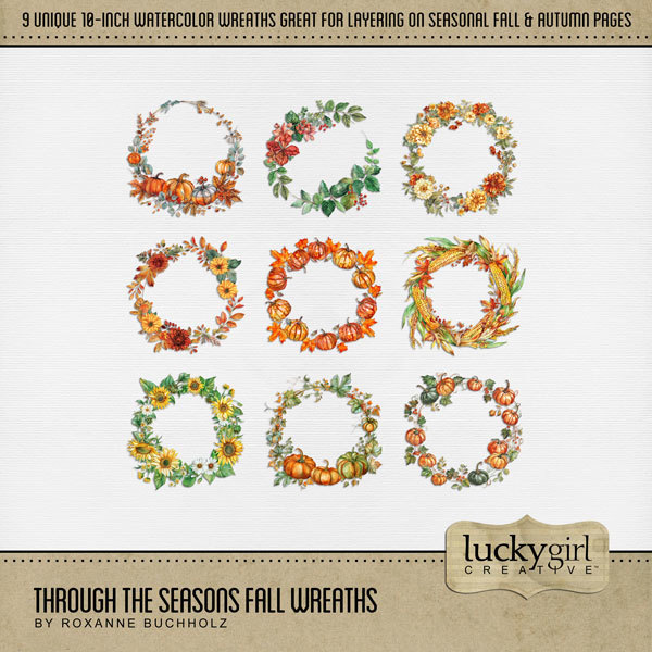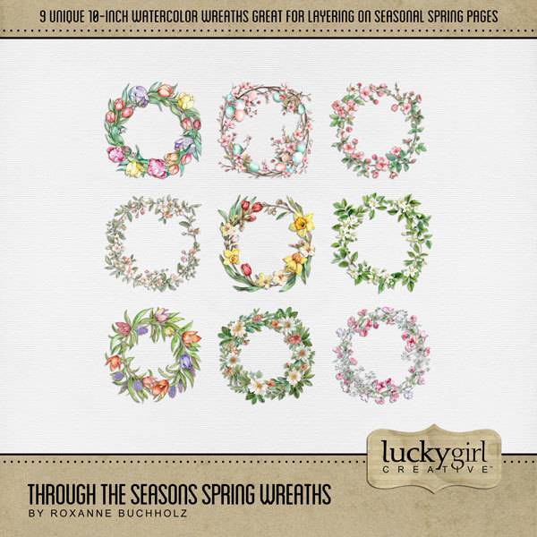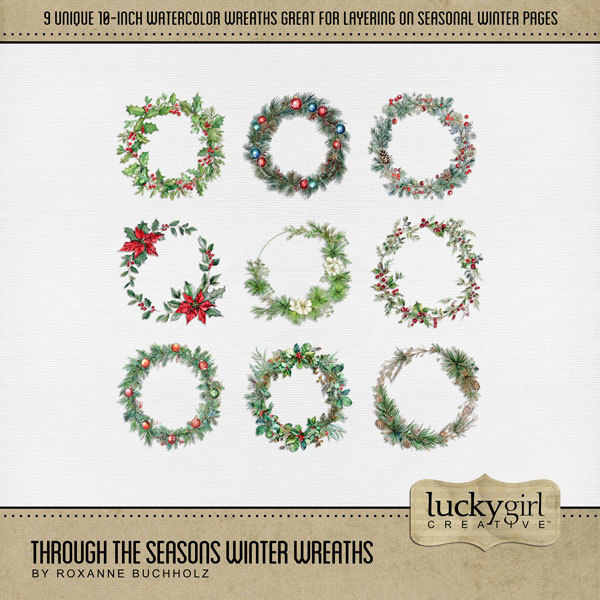 Add these beautiful watercolor wreaths to all your seasonal digital scrapbooking pages, albums, calendars, holiday greeting cards, and wall decor! Each wreath is 10" wide but can be re-sized to fit your project. Elements include flowers and greenery from winter, spring, summer, and winter. TIP: Try layering the various wreaths to create a new look every time. Add photos and additional embellishments for a stunning page layout! This bundle includes Through the Seasons Winter Wreaths, Through the Seasons Fall Wreaths, Through the Seasons Spring Wreaths, and Through the Seasons Summer Wreaths. Designer: Roxanne Buchholz, Lucky Girl Creative