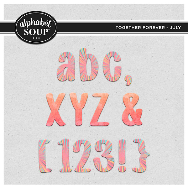 Add the perfect title or word art to your page with alphas by Alphabet Soup. This purchase is for the Together FOREVER Alpha - July. It includes two individual alphas (each with a-z, A-Z, 0-9 and punctuation).