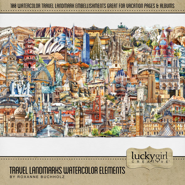 BRAND NEW for the The Pixie 500 Virtual Crop on Friday, April 17 - Sunday, April 19, 2026! Offered at an introductory low price of $39.95. Retail Value: $67.55. Designed with the world traveler in mind, this beautiful watercolor collection showcases international landmarks around the globe including North and South America, Europe, South America, Australia, Asia, and Africa. Landmarks include architecture, arch, downtown, Sydney Opera House, New Orleans, Coit Tower, San Francisco, California, Angkor Wat, Cambodia, CN Tower, Canada, castle, cathedral, cave, Chand Baori India, Great Wall of China, Temple of Heaven, Beijing, Greece, church, Quebec, Egypt, pyramid, sphinx, tomb, Eiffel Tower, Paris, France, Big Ben Clock Tower, St. Paul's Cathedral, Tower Bridge, London, Windsor Castle, Forbidden City, China, Arc de Triomphe, Louvre Museum, Mont Saint Michel, Notre Dame, Palace of Versailles, Dome des Invalides, Grand Palais, Germany, Neuschwanstein, Bavaria, Parthenon, ruin, Hindu Temple, Willis Tower, Chicago, India, Agra Fort, Gateway to India, Colosseum, St. Mark's Campanile Bell Tower, Venice, Trevi Fountain, Golden Pavilion, Japan, Leaning Tower of Pisa, Italy, Mexico, Chichen Itza, Mission Bell Tower, Monastery, Normandy, skyscraper, New York, pagoda, Peru, Machu Picchu, Petra Wadi Musa, Jordan, Prambanan, Indonesia, St. Basil Cathedral, Red Square, Russia , Spain, Barcelona, Sagrada Familia, Taj Mahal, Thailand, Texas, Alamo, Grand Palace, The Brandenburg Gate, Times Square, Space Needle, Seattle, Blue Mosque, Istanbul, Turkey, United Emirates, Burj Al Arab Hotel, Dubai, Washington DC, Golden Gate Bridge, Pont Alexandre Bridge, Boston, French Quarter, Dam, Chile, Easter Island, England, Stonehenge, Mount Rushmore, America, United States, Sydney Harbour Bridge, Uluru, mountains, lighthouse, Statue of Liberty, and Abraham Lincoln. This bundle includes Travel Landmarks Watercolor Elements, Travel Landmarks Watercolor Papers 1, Travel Landmarks Watercolor Papers 2, Travel Landmarks Watercolor Papers 3, Travel Landmarks Watercolor Papers 4, Abstract Scenic Watercolor Papers, Wander Alpha Set, Travel Alpha Set, and Travel Watercolor Word Art. Designer: Roxanne Buchholz, Lucky Girl Creative