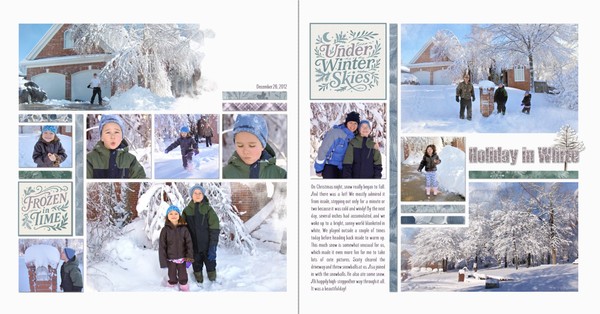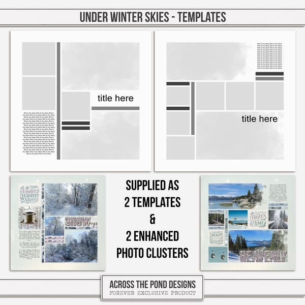 Under Winter Skies Bundle brings together a coordinated collection designed for effortless mixing and matching. The bundle includes 2 versatile templates with their associated enhanced art group clusters, 1 complete alpha set, 9 pieces of themed word art, and 20 beautifully designed papers.Each element has been created to work seamlessly with the others, making it easy to blend textures, titles, and embellishments into a cohesive design. Whether you prefer clean, simple layouts or richly layered pages, this bundle provides the flexibility and creative control to craft your perfect winter scrapbook page.