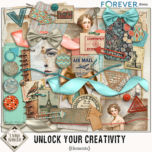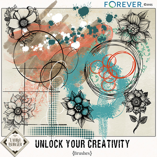 Ignite your imagination with Unlock Your Creativity, the ultimate digital scrapbooking mega bundle designed to inspire your inner artist. Whether you're a seasoned memory keeper or just beginning your creative journey, this beautifully curated collection has everything you need to bring your stories to life.Inside, you'll find a vibrant mix of high-resolution papers, whimsical embellishments, stylish brushes, and many masks with effects – all crafted to spark inspiration and make scrapbooking effortless and fun. Perfect for digital layouts, photo albums, journaling, and even hybrid projects.Let your ideas flow and your memories shine. With Unlock Your Creativity, every page becomes a masterpiece.Keywords: Designs by Laura Burger, Laura Burger, creative, imagination, brushes, texture, grunge, pattern, effects, masks, teal, brown, tan, cream, mint green, rust, turquoise, green, bow, canvas, flairs, flowers, blooms, stems, leaf, ribbon, photo attachment, attachment, staples, angel, brad, Ephemera, stamps, frames, string, staples, tag