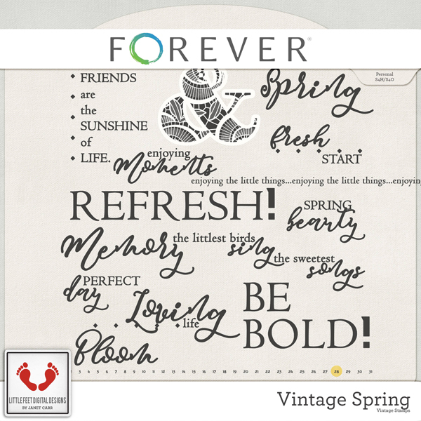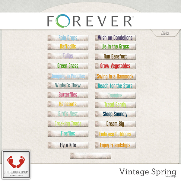 Here's to making sure your wonderful spring moments last forever! Every spring has a story, and if yours is swinging in a hammcok on a breezy spring day, breeze blowing through your hair on a bike ride, kicking your feet up and letting the sunshine warm your face, or embracing time outside with family and friends, this kit is the one for you! Filled to the brim with gorgeous florals, beautiful themed elements, and so much more! This kit will help you keep all of your favorite spring moments close to your heart. Features a beautifully eclectic mix of shabby, vintage papers and elements in a refreshingly happy color palette. Little Feet Digital Designs is EXCLUSIVE to Forever.