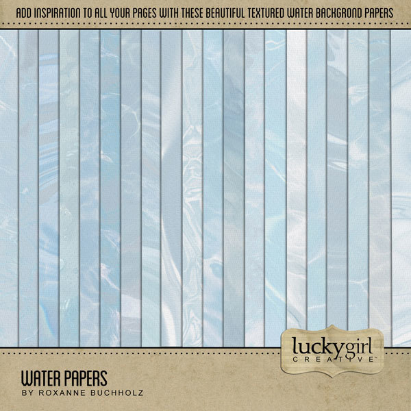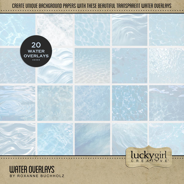 Add beautiful transparent overlays and textured papers to all your digital scrapbooking pages! In hues of soft blue, the water papers add so much warmth and depth to all your memory keeping projects. Try layering over different colored digital papers to create a one-of-a-kind look! Great for summer, beach, lake, pool, swimming, bath, flood, and outdoor and nature pages with scenes of water ripples and waves. This kit includes the Water Papers and the Water Overlays. Designer: Roxanne Buchholz, Lucky Girl Creative