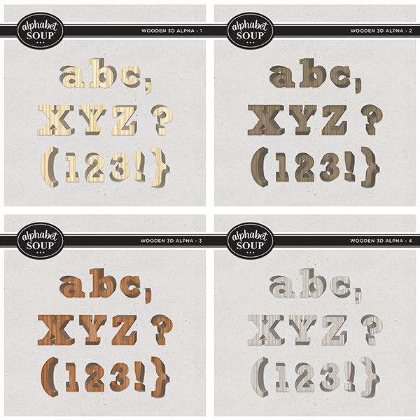 Add the perfect title or word art to your page with alphas by Alphabet Soup. This purchase is for the Wooden 3D Alpha Bundle. It includes four unique alphas (each with a-z, A-Z, 0-9 and punctuation).